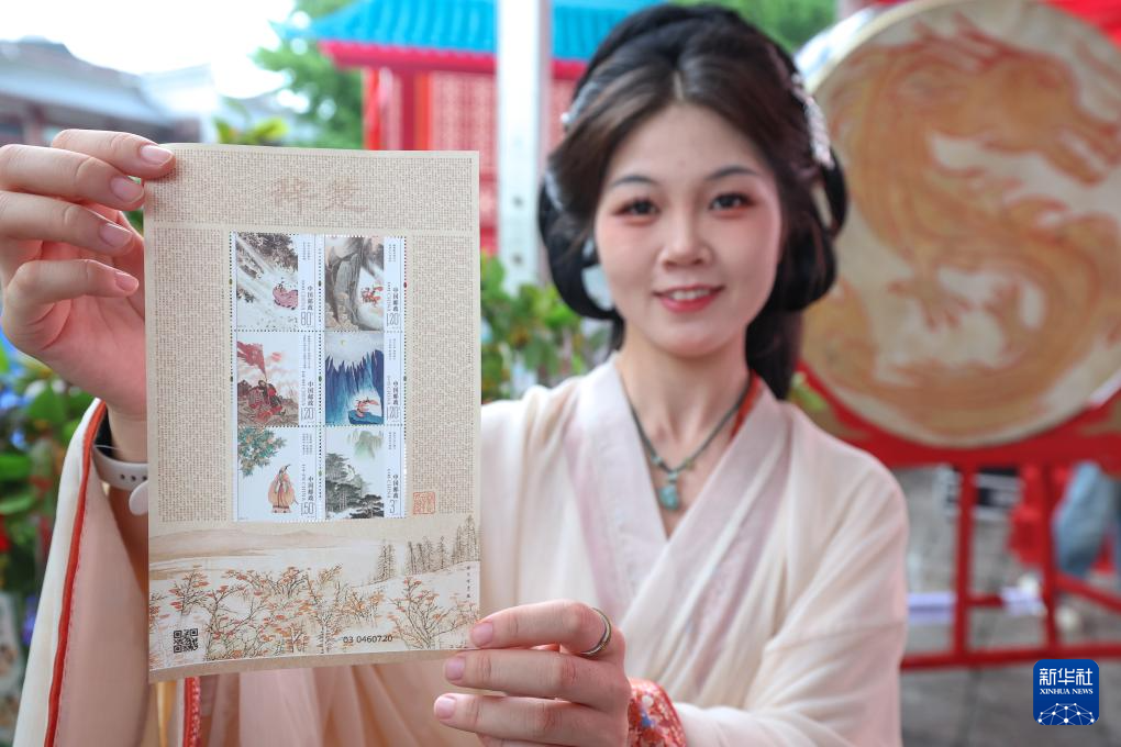 5月31日,在湖北省襄阳市昭明台广场举行的《楚辞》特种邮票首发式上,工作人员展示《楚辞》特种邮票。