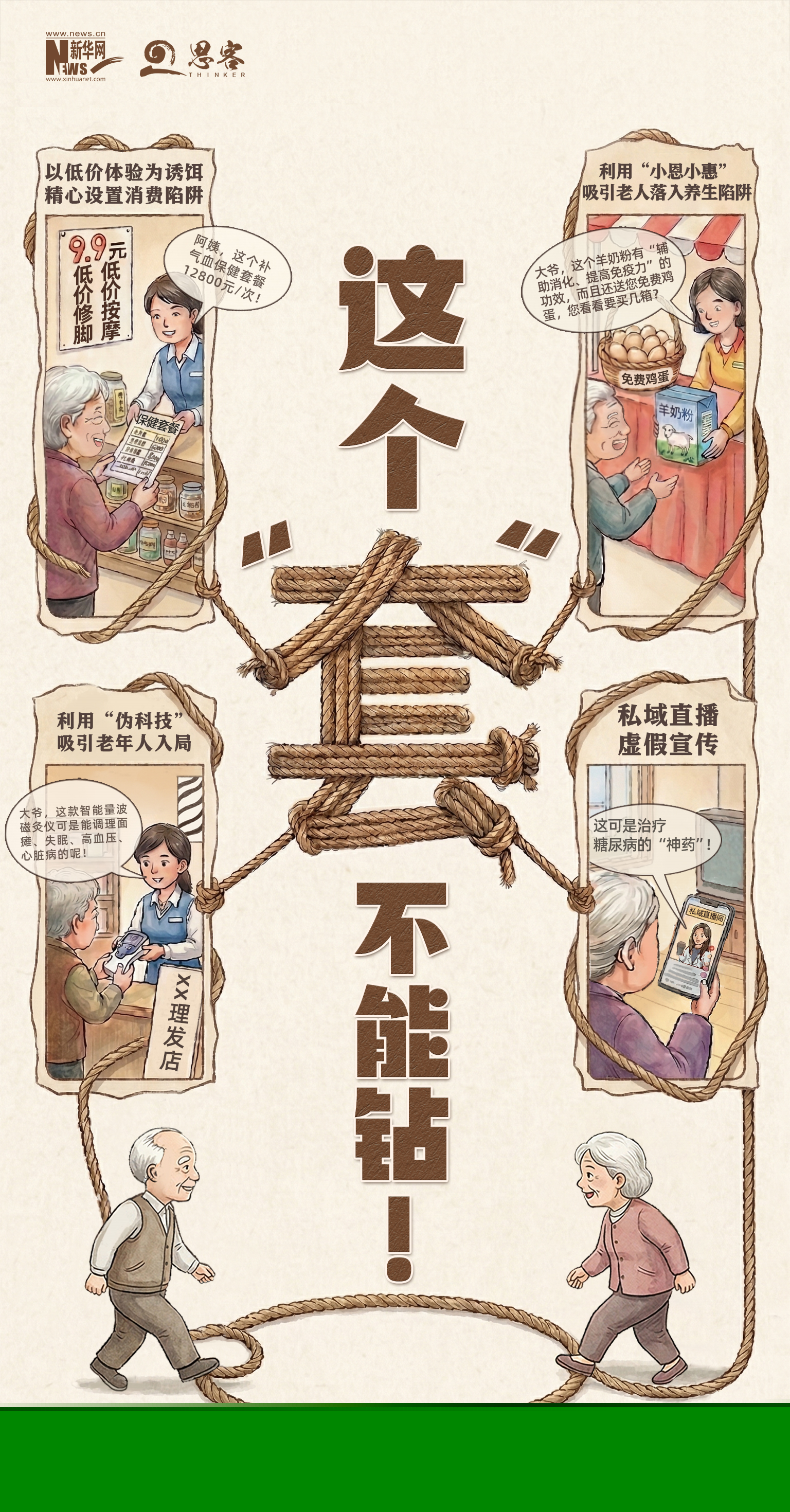 随着老龄化程度日益加深,老年群体的健康需求不断增长,养生保健“坑老”骗局层出不穷、花样翻新。从免费领鸡蛋、听课送红包的小恩小惠,到包治百病的保健神药、天价理疗套餐,一场场看似诱人的养生礼包,背后尽是算计老年人积蓄的圈套。唯有依法严打、露头就打,才能戳破养生陷阱的伪装,守住老年人的“钱袋子”,不让养生成为欺骗老年人的圈套。