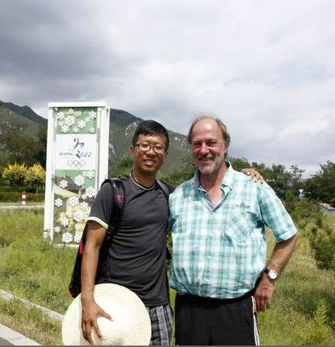 2015年8月,中国雪橇队在北京延庆组织第一次跨界跨项选材,武大伟和时任国家队外教沃夫冈合影