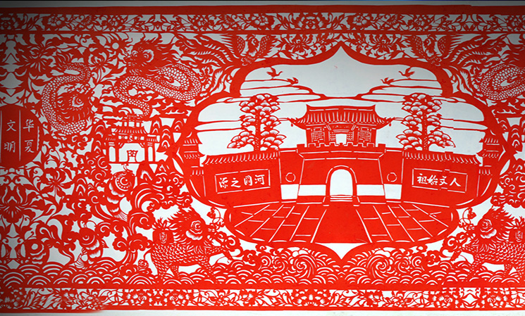 于是我決定回家專(zhuān)門(mén)剪紙,但是我父母認(rèn)為鉸花都是老婆婆們閑著沒(méi)事做的事,你一個(gè)男孩子還是應(yīng)該好好賺錢(qián)。就這樣我跟父母僵持了很久,但最后還是我拗著性子從外邊回到了我們農(nóng)村老家,開(kāi)始尋找會(huì)剪紙的老人,去記錄、去詢問(wèn)、學(xué)習(xí)我們地區(qū)傳統(tǒng)的剪紙民俗知識(shí)。因?yàn)楝F(xiàn)在像剪紙這個(gè)藝術(shù),在我們的地區(qū)還僅是一些老人出自一些喜好去剪、去做,但隨著這些老人的去世,這些作品也就會(huì)隨著一把火被燒掉。我希望我能把這些東西都保留下來(lái),我希望有更多的人去了解我們地區(qū)的剪紙文化,所以我就下決心收集這些剪紙的資料,去申報(bào)非物質(zhì)文化遺產(chǎn)名錄。想要申報(bào)還要去做很多的事情,一是去尋找這些傳世的老作品,另外就是要擴(kuò)大孟津剪紙的影響力,參加各種比賽去獲獎(jiǎng)。那時(shí)我白天去尋找老藝人,晚上就自己在屋里埋頭創(chuàng)作,每天晚上都會(huì)剪到凌晨一點(diǎn)多。我媽本來(lái)是反對(duì)的,但是當(dāng)她看到每晚我都會(huì)剪到很晚,她就明白了我是真心喜歡這個(gè)事兒,就慢慢地開(kāi)始心疼我。后來(lái)她也幫助我開(kāi)始粘貼,像我剪的《都說(shuō)我孟津好風(fēng)光》,這個(gè)作品長(zhǎng)13米,沒(méi)有那么長(zhǎng)的紙,我們就一起粘貼。花了三個(gè)多月剪完,家里邊沒(méi)有那么大粘貼裝裱的空間,我父母就站在我們家院子的平房頂上一起把它鋪開(kāi),一個(gè)一個(gè)地粘起來(lái)裱好。