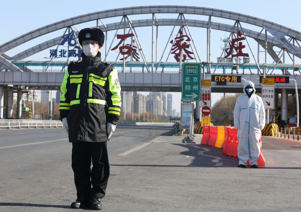 ↑1月7日,石家莊市公安局交通管理局裕華東警務站民警在新元高速石家莊裕華路進出口執勤。