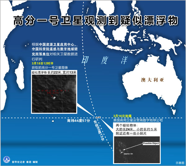 ??? 3月18日12時許獲取的高分一號衛星圖像中,南印度洋海域(南緯44度57分,東經90度13分),觀測到疑似漂浮物。這一疑似漂浮物長約22米,寬約13米,距澳大利亞公布疑似物位置南偏西120公里左右。新華社發(國防科工局供圖)
