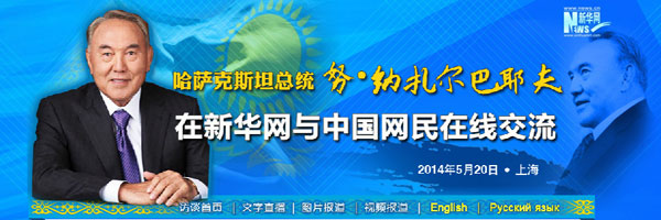 ??? 新華網(wǎng)上海5月20日電 哈薩克斯坦總統(tǒng)納扎爾巴耶夫20日接受新華網(wǎng)獨(dú)家訪談與中國(guó)網(wǎng)民在線交流,回答中國(guó)網(wǎng)民的問(wèn)題。
