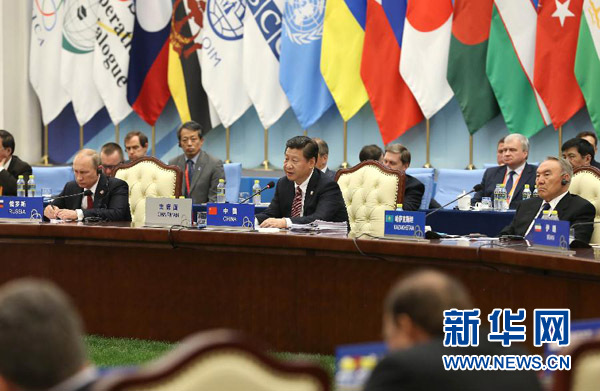 ????與會各方就亞洲地區安全形勢以及反恐、糧食安全、能源安全、網絡安全、核裁軍和防擴散等問題廣泛交換意見,一致認為,亞洲各國面臨的相同任務是發展,需要安全穩定的環境。各方愿發揚團結合作、同舟共濟精神,推動亞信進程,加強政治、安全對話和合作,增進互信,把亞洲建成持久和平、共同繁榮的和諧地區。各方高度評價中國為促進亞洲和世界和平、穩定、繁榮作出的重大貢獻,贊賞中國堅持和平發展和睦鄰友好,支持中方倡導的亞洲安全觀,表示愿同中方攜手努力,共建絲綢之路經濟帶,加強經濟融合和互聯互通,共同應對各種威脅和挑戰,協力打擊“三股勢力”,實現共同安全、共同發展、共同繁榮。各方相信中方擔任亞信主席國,一定能有力推動亞信發展。這次峰會一定會成為亞信史上新的里程碑。
