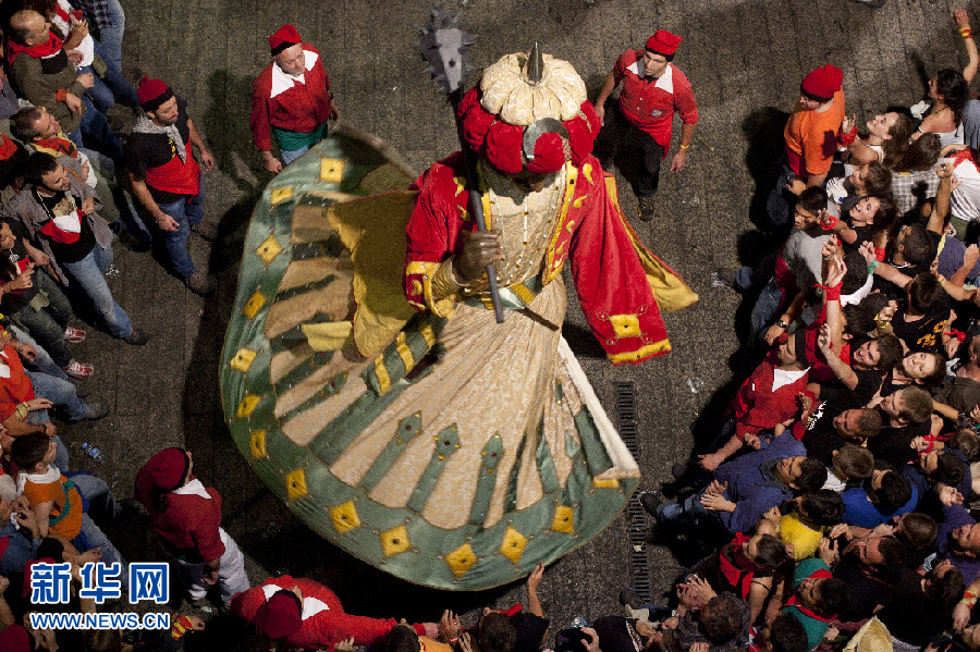 西班牙貝爾加(Berga)市的La Patum節(jié)上,巨大的人偶穿過狂歡的人群。