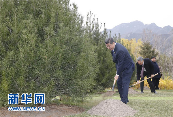 11月11日,國家主席習近平同亞太經合組織經濟體領導人或代表一道,在雁棲島上的夏園共同種下21棵白皮松,紀念亞太經合組織成立25周年,表達對亞太互信、包容、合作、共贏的良好祝愿。