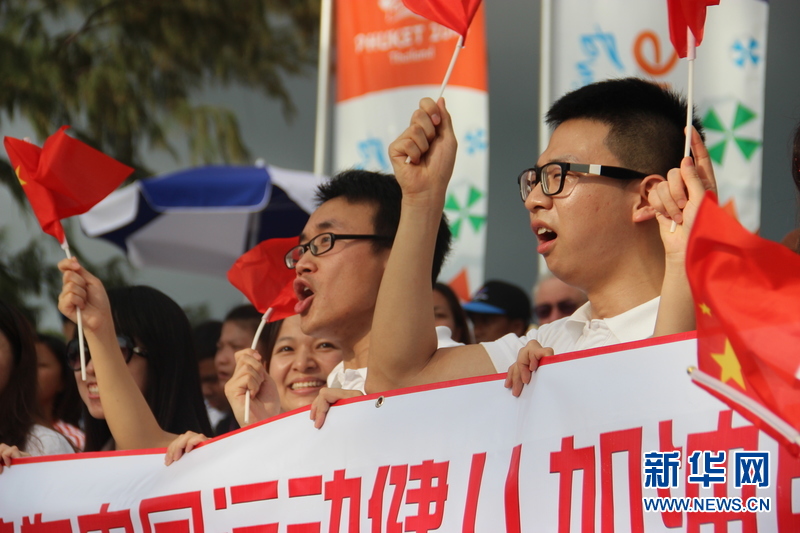 ??? 11月16日,普吉孔子學院的中國志愿者老師們為中國運動健兒加油。中國體育代表團16日在泰國普吉舉行的第四屆亞洲沙灘運動會上勇奪2枚金牌和2枚銅牌。當天比賽全部結束時,中國隊以3金2銀5銅的成績暫列獎牌榜第五,東道主泰國隊以9金11銀12銅的成績暫列金牌榜和獎牌榜第一。新華社記者楊云燕攝