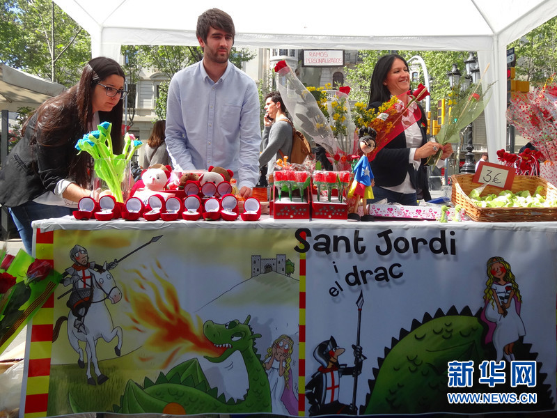 今年的“圣喬治節(jié)”是個(gè)天空晴朗陽(yáng)光燦爛的日子,在巴塞羅那市中心的加泰羅尼亞廣場(chǎng)及周邊街道上,臨時(shí)搭建起了很多賣(mài)書(shū)和賣(mài)花的攤位。大街上到處可以見(jiàn)到手持鮮花的女士,或者拿著書(shū)的男士。