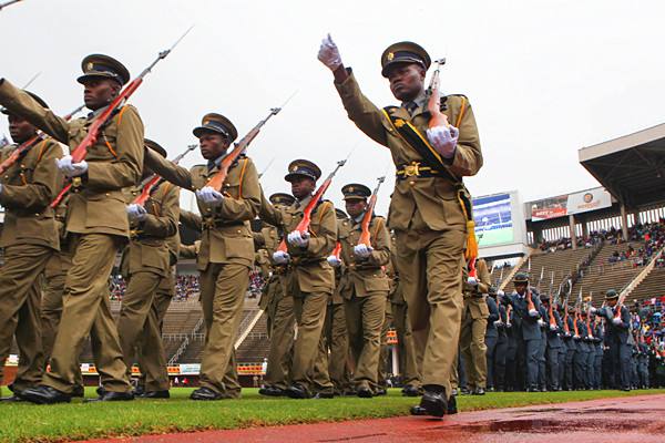 2015年4月18日,在中國援建的津巴布韋國家體育場內,津國防軍進行表演。(新華社發,費列蒙攝)