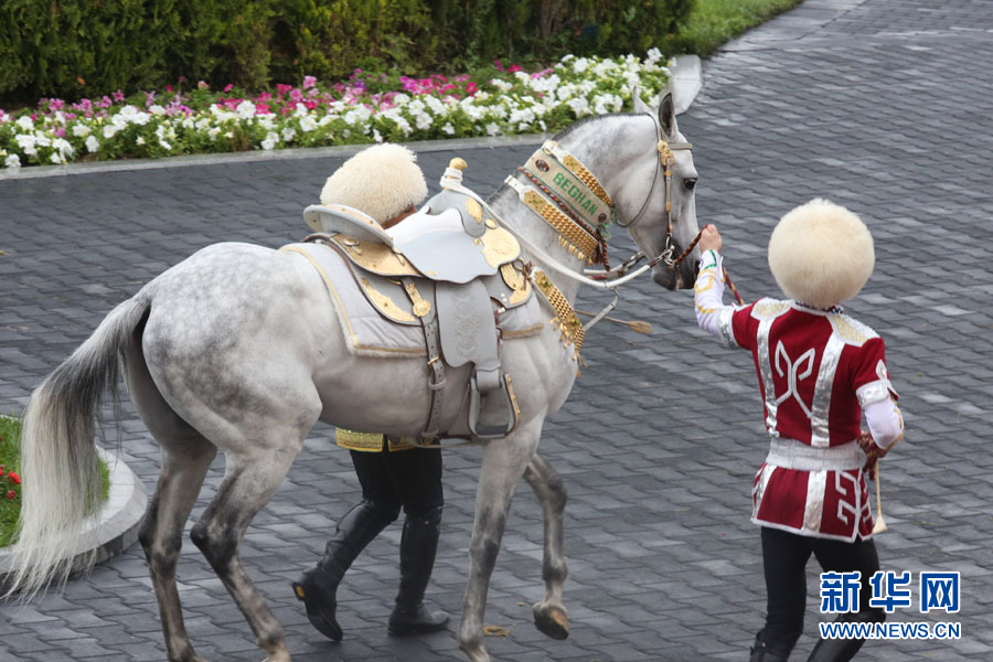 4月23日在土庫曼斯坦首都阿什哈巴德拍攝的獲得2016年度“最美汗血馬”稱號的“別格汗”。新華網記者 盧敬利 攝
