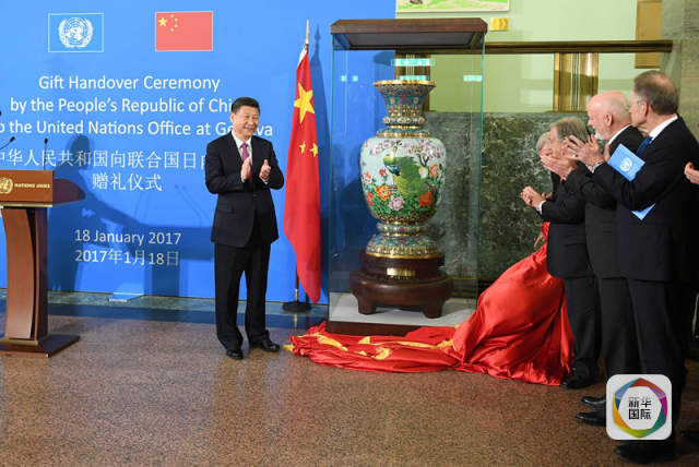 1月18日,國家主席習近平在瑞士日內瓦萬國宮出席“共商共筑人類命運共同體”高級別會議,并發表題為《共同構建人類命運共同體》的主旨演講。這是會議結束后,習近平出席中國向聯合國日內瓦總部贈禮儀式。(新華社記者張鐸攝)