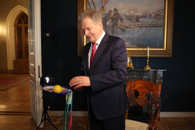 4月3日,赫爾辛基,芬蘭總統(tǒng)尼尼斯托看到新華社記者贈送的太極柔力球高興得親自玩了幾下。(新華社記者張璇攝)