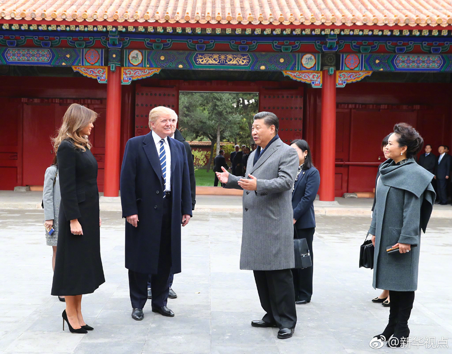 新華網(wǎng)北京11月8日電 國家主席習(xí)近平和夫人彭麗媛8日下午在故宮博物院迎接來華進(jìn)行國事訪問的美國總統(tǒng)特朗普和夫人梅拉尼婭。兩國元首夫婦在寶蘊(yùn)樓簡(jiǎn)短茶敘。