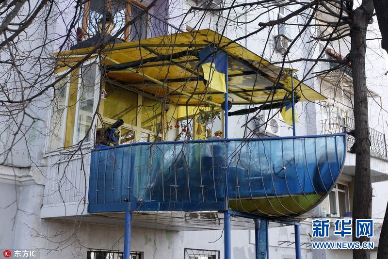 【帥!軍艦陽臺】2017年3月30日,烏克蘭基輔,72歲的老人Olexander Shkolnik曾是一名海軍少校。退役后,老人將自家陽臺打造成了軍艦模樣,以紀念自己的海軍生涯。