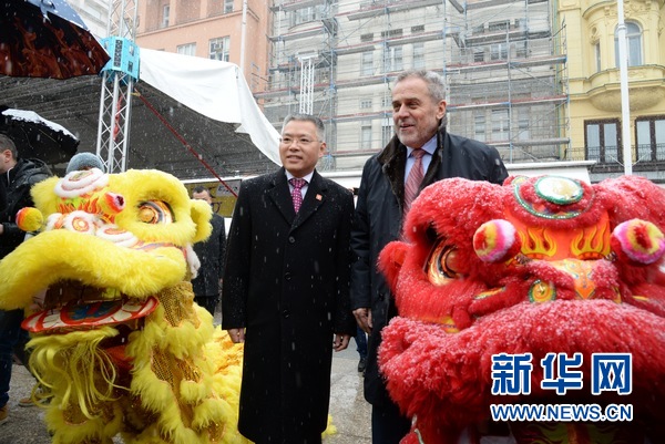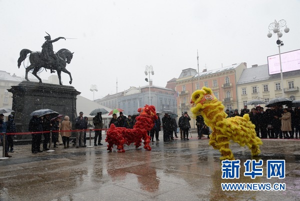 當(dāng)?shù)貢r(shí)間12日中午,來(lái)自斯洛伐克中國(guó)武術(shù)協(xié)會(huì)的舞獅表演隊(duì)冒雪表演傳統(tǒng)舞獅節(jié)目,中國(guó)駐克羅地亞大使胡兆明和薩格勒布市長(zhǎng)米蘭·班迪奇為舞獅點(diǎn)睛,熱鬧的鑼鼓和一紅一黃兩頭“獅子”吸引了大批市民駐足觀看。