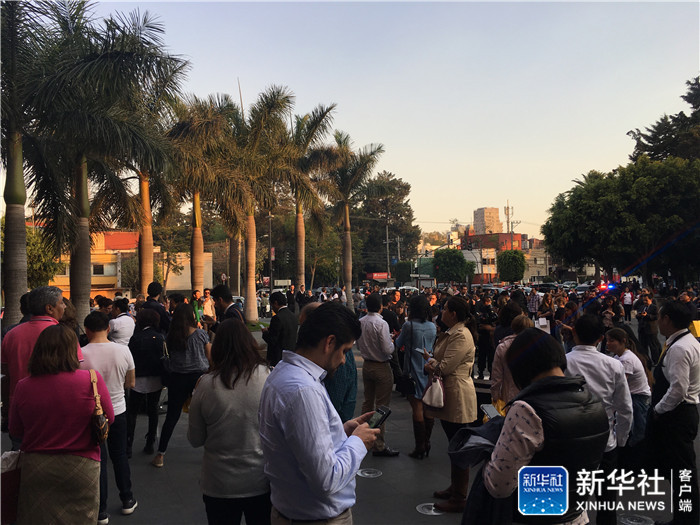 2月16日,人們在墨西哥首都墨西哥城一商場前的廣場避險。新華社記者許睿攝