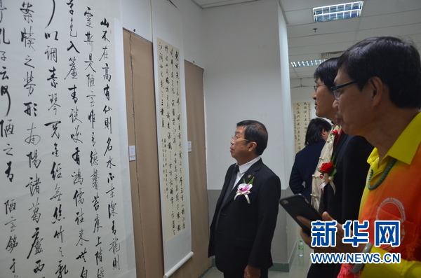 嘉賓欣賞參展書法作品。新華網發(王大瑋攝)