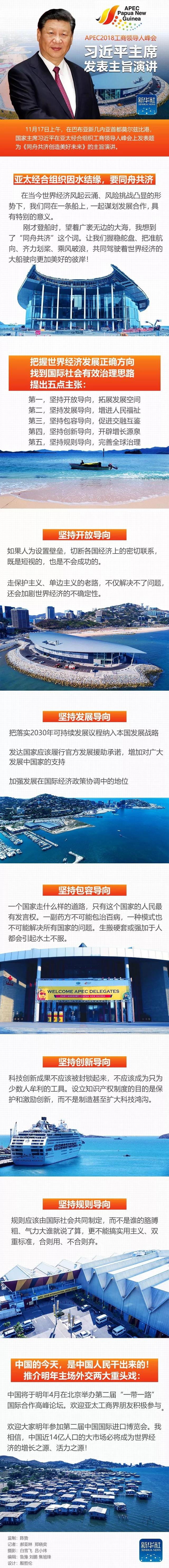 11月17日上午,在巴布亞新幾內亞首都莫爾茲比港,國家主席習近平在亞太經合組織工商領導人峰會上發表題為《同舟共濟創造美好未來》的主旨演講。