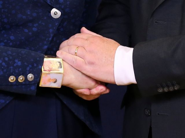 2018年11月25日,在比利時布魯塞爾,歐盟委員會主席容克(右)與英國首相特雷莎·梅握手。(新華社記者葉平凡攝)