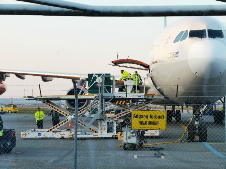 4月4日,在丹麥首都哥本哈根的凱斯楚普國際機場,工作人員將裝有中國大熊貓的箱子搬出,準備運往哥本哈根動物園。(新華社發 李鵬飛攝)