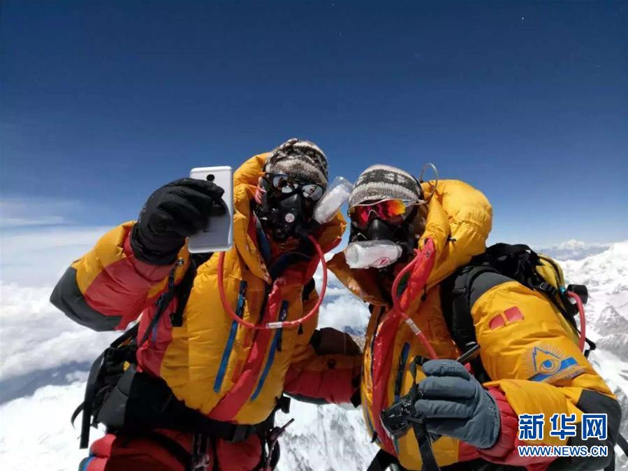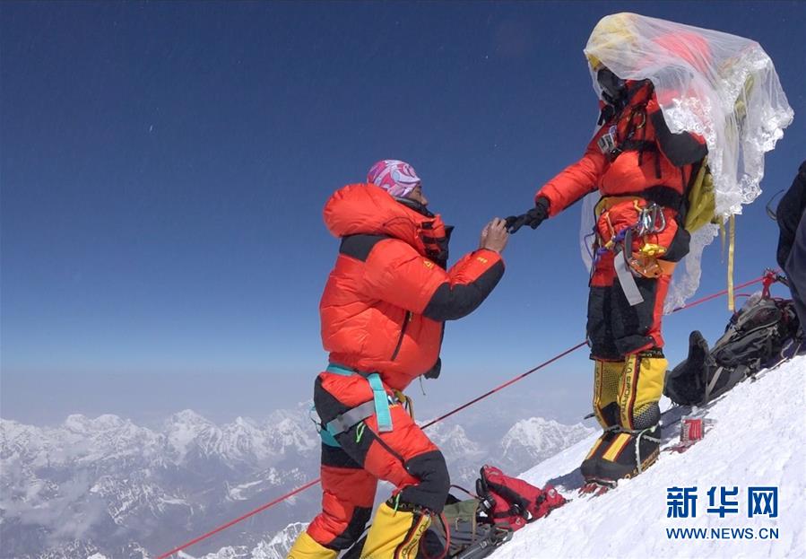 珠穆朗瑪峰頂,王銀龍向關嫻求婚(2018年5月16日攝)。新華社發(fā)