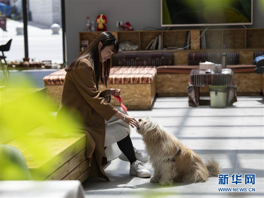 關嫻在拉薩自己開的客棧里與寵物互動(4月10日攝)。新華社發(fā)(孫非 攝)