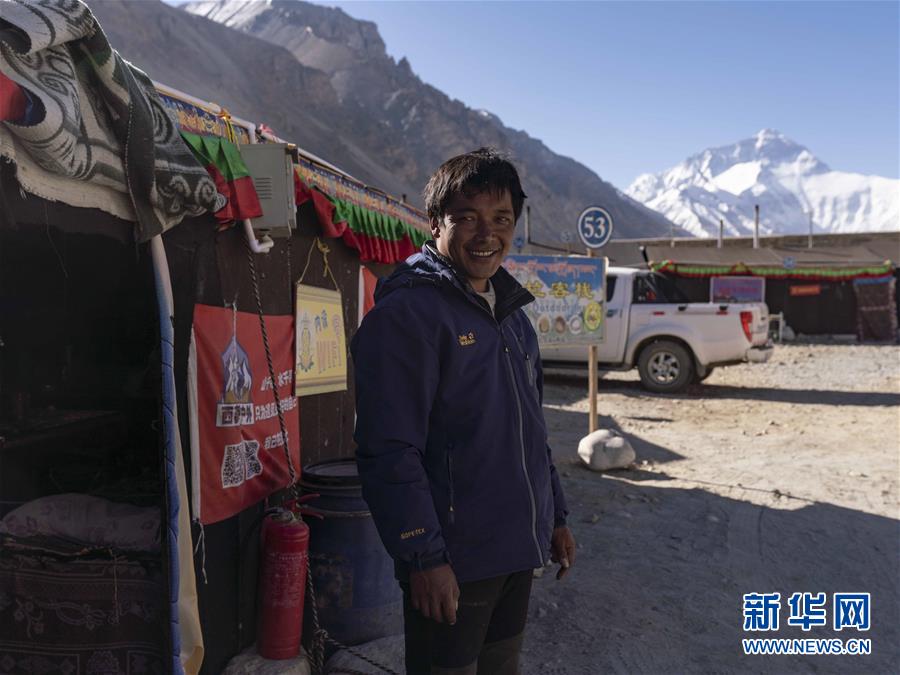 益格站在他經(jīng)營的帳篷旅館前,益格后方山峰為珠穆朗瑪峰(4月28日攝)。新華社發(fā)(孫非 攝)