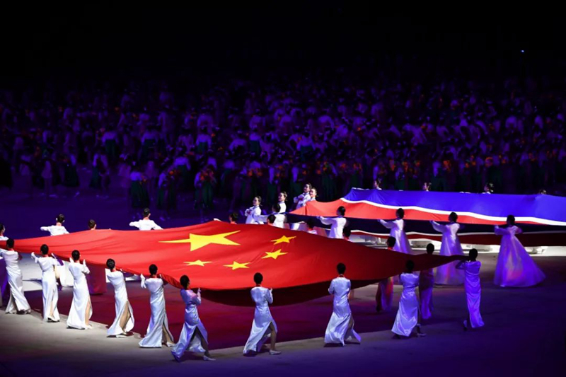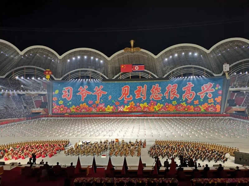 當地時間晚9時40分許,習近平和夫人彭麗媛在金正恩和夫人李雪主陪同下,來到體育場主席臺。在場觀眾全體起立,以熱烈的掌聲和歡呼聲,歡迎中國貴賓的到來。