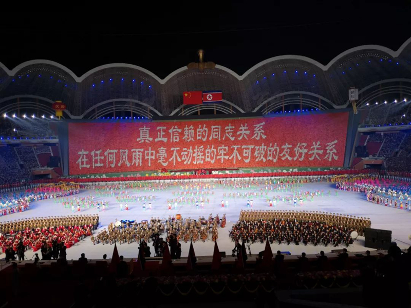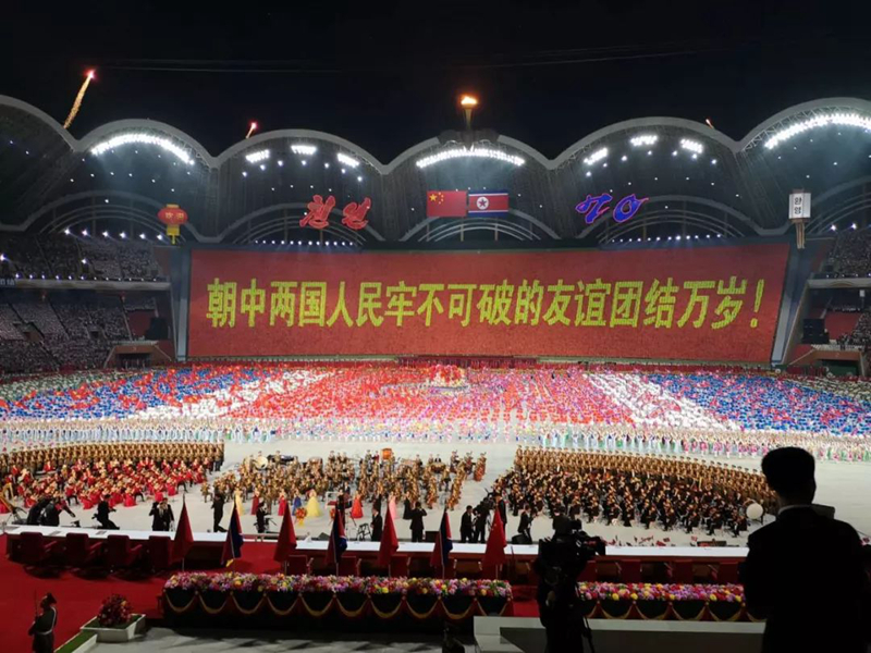 演出在以“朝中友誼萬古長青”為主題的大型歌舞表演中結束。習近平和金正恩同全場觀眾一起站立,為藝術家和演員們的精湛表演送上經久不息的掌聲。