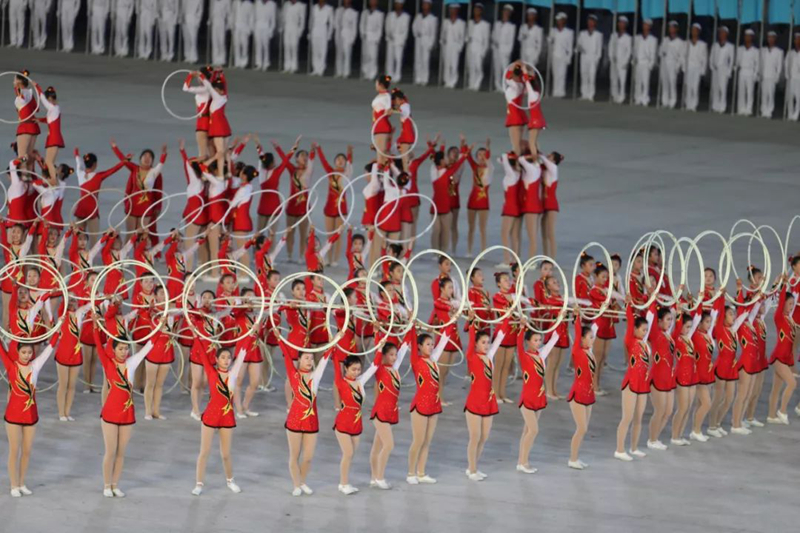 平壤大同江畔,綾羅島“五一”體育場是團體操的主要舞臺。演出以朝鮮民族獨特的“歌舞之美”、富有活力的團體操、嘆為觀止的雜技表演,展現出朝鮮革命與戰爭、政治和軍隊建設、民生與經濟發展以及對外交往的宏偉畫卷。