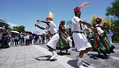 7月2日,在白俄羅斯首都明斯克郊區的中白工業園,身著白俄羅斯民族服裝的人們在演唱民族歌曲。新華社發(任科夫攝)