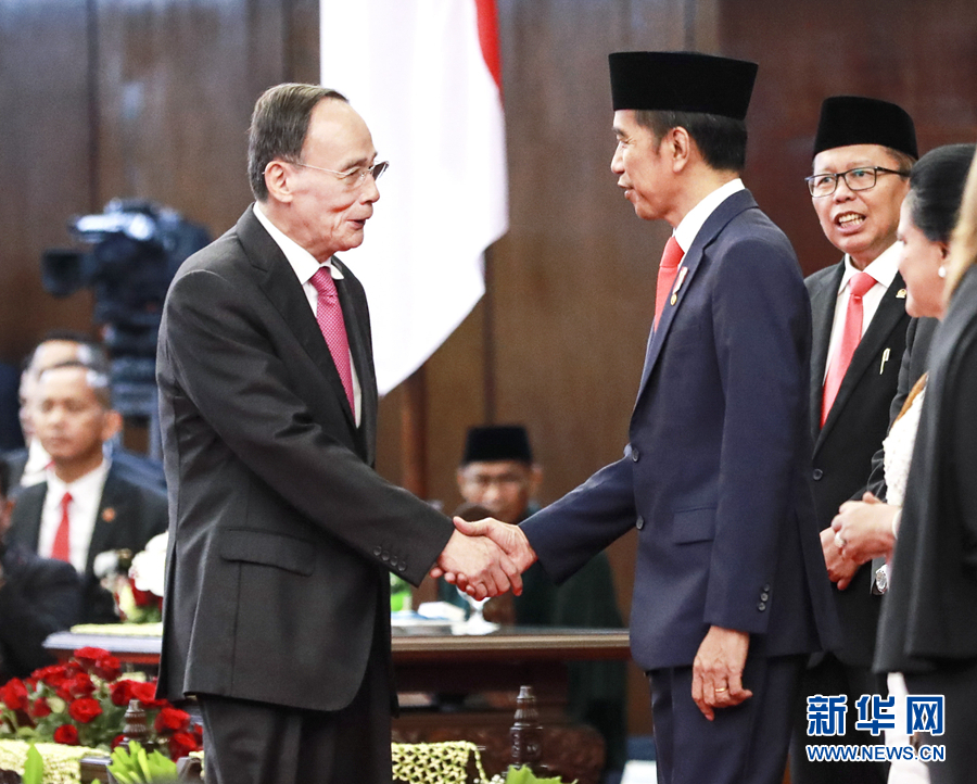 這是10月20日,王岐山在佐科總統(tǒng)連任就職儀式上向佐科致賀。 新華社記者龐興雷攝