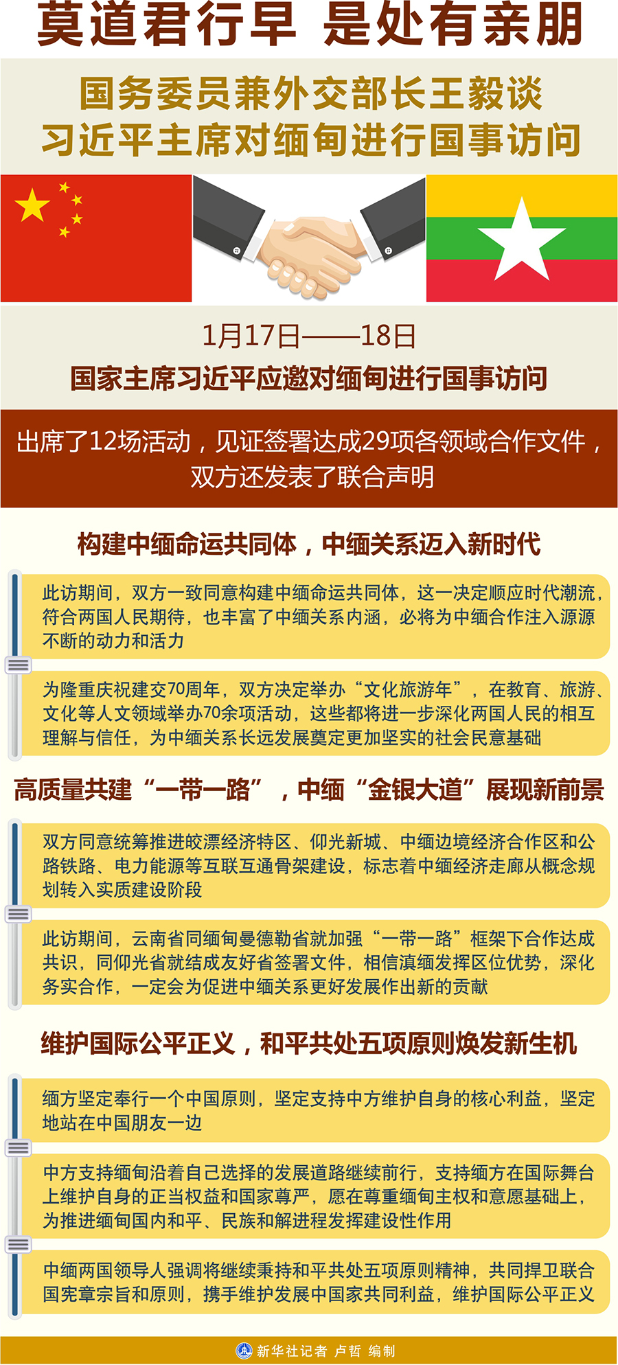 王毅說,習近平主席新年首訪緬甸,是黨中央著眼外交全局采取的一次重大周邊外交行動,此訪時間雖短,但日程緊湊,成果豐碩。習近平主席出席了12場活動,見證簽署達成29項各領域合作文件,雙方還發表了聯合聲明。緬方對習近平主席此訪期待已久,給予最高禮遇隆重接待。緬甸總統溫敏和國務資政昂山素季聯袂出席重大活動,緬甸第一、第二副總統及所有內閣成員、聯邦議會兩院議長以及主要政黨負責人悉數出面,陪同習近平主席出席中緬建交70周年系列慶?;顒郁咧芯捨幕糜文陠觾x式。