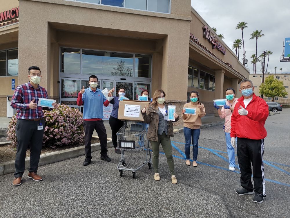 2020年4月7日,在美國洛杉磯縣天普市,美國南加州華人聯(lián)合總會代表向當?shù)匾患宜幍昃栀浛谡謺r合影。(新華社發(fā))