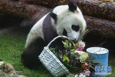 資料圖片:2019年7月31日,在俄羅斯首都莫斯科,大熊貓“如意”享用工作人員為它準備的“生日蛋糕”。新華社記者 白雪騏 攝