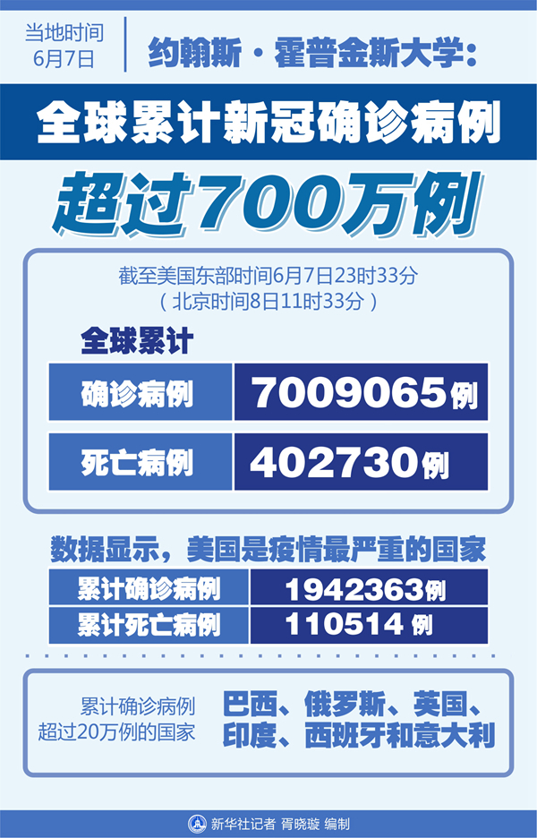 新華社紐約6月7日電 美國約翰斯·霍普金斯大學7日發布的新冠疫情統計數據顯示,截至美國東部時間7日23時33分(北京時間8日11時33分),全球累計確診病例達到7009065例,死亡病例為402730例。
