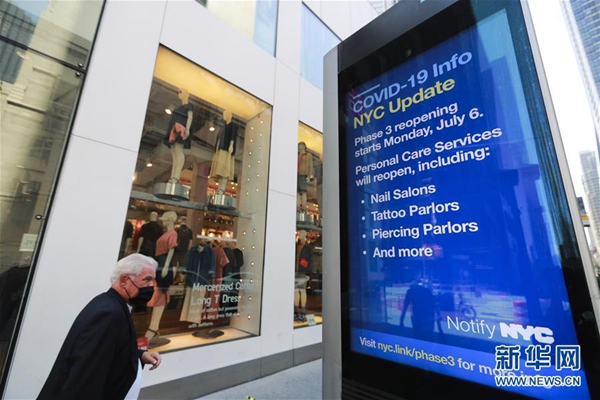 7月4日,一名行人從美國紐約第五大道顯示新冠疫情最新情況的信息屏旁經過。新華社記者 王迎 攝