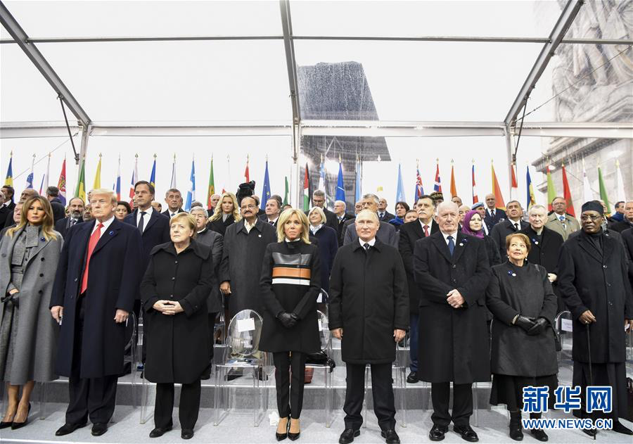 2018年11月11日,在法國巴黎,俄羅斯總統普京(前右四)、德國總理默克爾(前左三)與美國總統特朗普(前左二)出席紀念儀式。當日,法國政府在巴黎凱旋門前舉行儀式,隆重紀念第一次世界大戰結束一百周年。新華社記者 陳益宸 攝