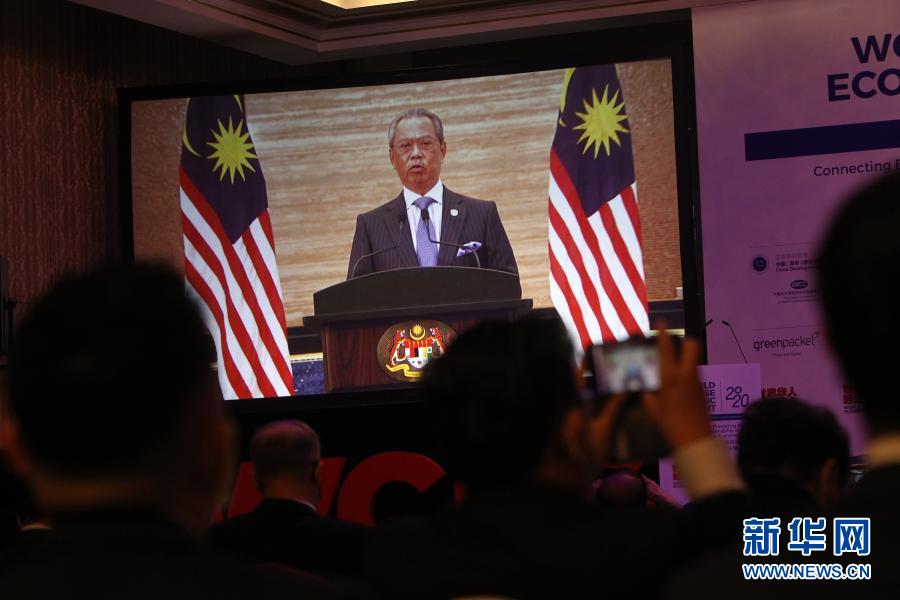 12月21日,在馬來西亞吉隆坡舉行的世界華人經濟峰會上,大屏幕播放馬來西亞總理穆希丁的視頻講話。新華社發