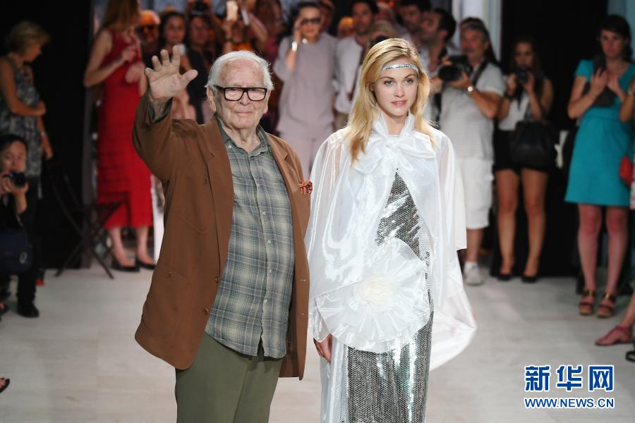 這張資料照片顯示,2016年7月9日,在法國普羅旺斯博尼約舊火車站臨時(shí)搭建的秀場(chǎng)里,皮爾·卡丹(左)在時(shí)裝秀結(jié)束時(shí)向觀眾揮手致意。新華社記者李根興攝