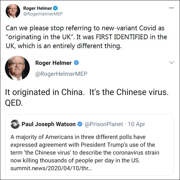 英國出現變異新冠病毒后,世衛組織(WHO)將起源地列為英國,不少主流媒體也引用了相關言論。但這讓英國右翼政黨獨立黨(UKIP)成員,曾擔任歐洲議會議員羅杰·赫爾默坐不住了。