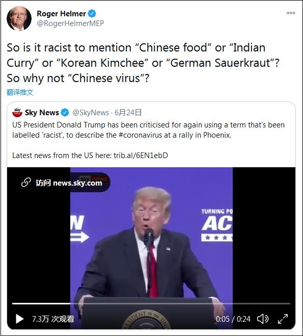 6月24日,赫爾默轉發了特朗普集會上喊“功夫病毒”的視頻,并評論稱:“說中國菜、印度菜、韓國泡菜或德國酸菜是種族歧視嗎?那么,為什么‘中國病毒’(是呢)?”
