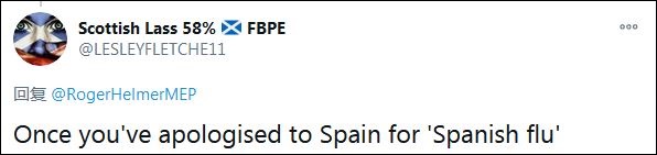 另一名網友接茬說:“只要你為‘西班牙流感’向西班牙道歉。”赫爾默也曾借用“西班牙流感”,為“中國流感”的說法狡辯。