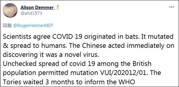 還有一名網友對比稱:“科學家同意新冠病毒起源自蝙蝠,變異后傳播給人類,中國人發現這是一種新病毒后,立即采取了行動。新冠病毒在英國人口中無限制的傳播,導致了變異新冠病毒(VUI/202012/01),保守黨等了3個月才通知世衛組織。”