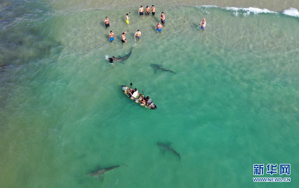 4月20日,在以色列北部城市哈代拉的海邊,鯊魚從人們身邊游過(guò)(無(wú)人機(jī)照片)。