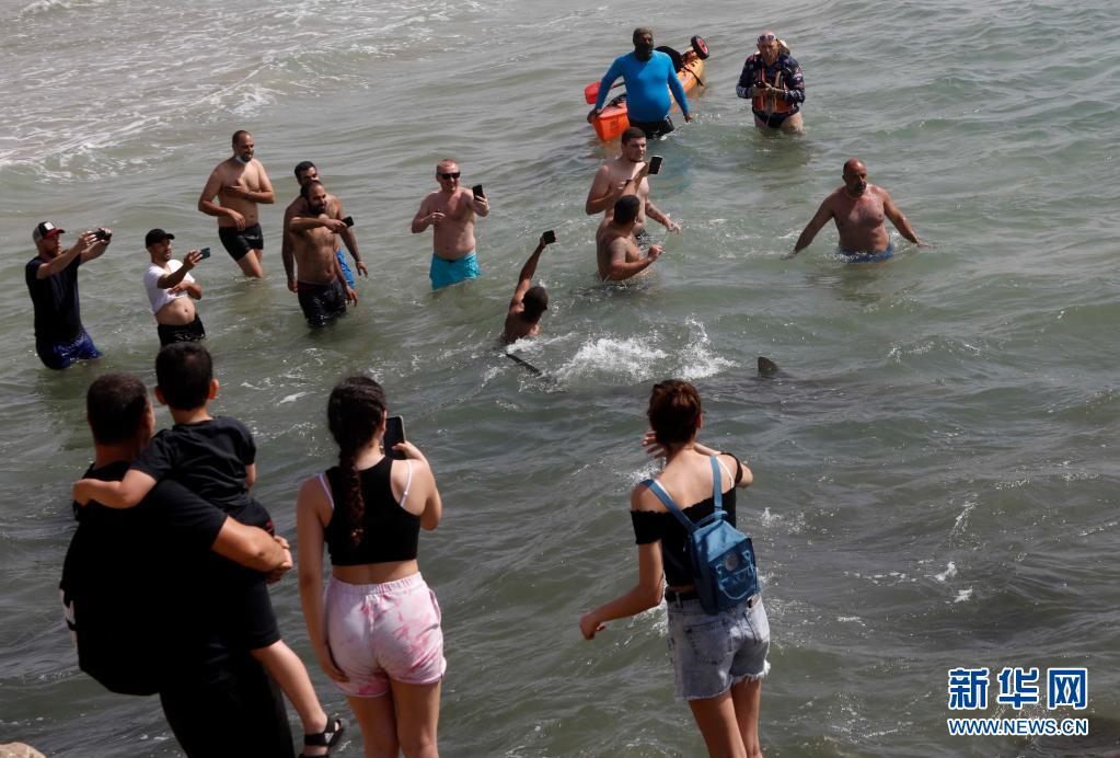 4月20日,在以色列北部城市哈代拉的海邊,鯊魚從人們身邊游過(guò)。