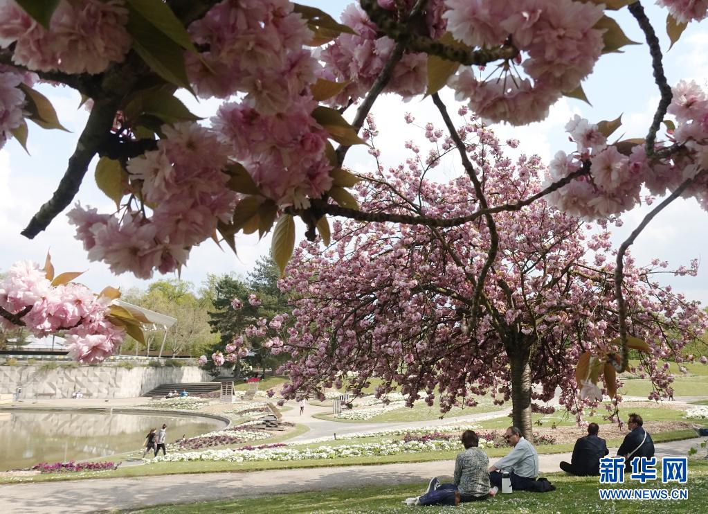 4月21日,人們?cè)诜▏?guó)巴黎一處公園的櫻花樹(shù)下休閑。