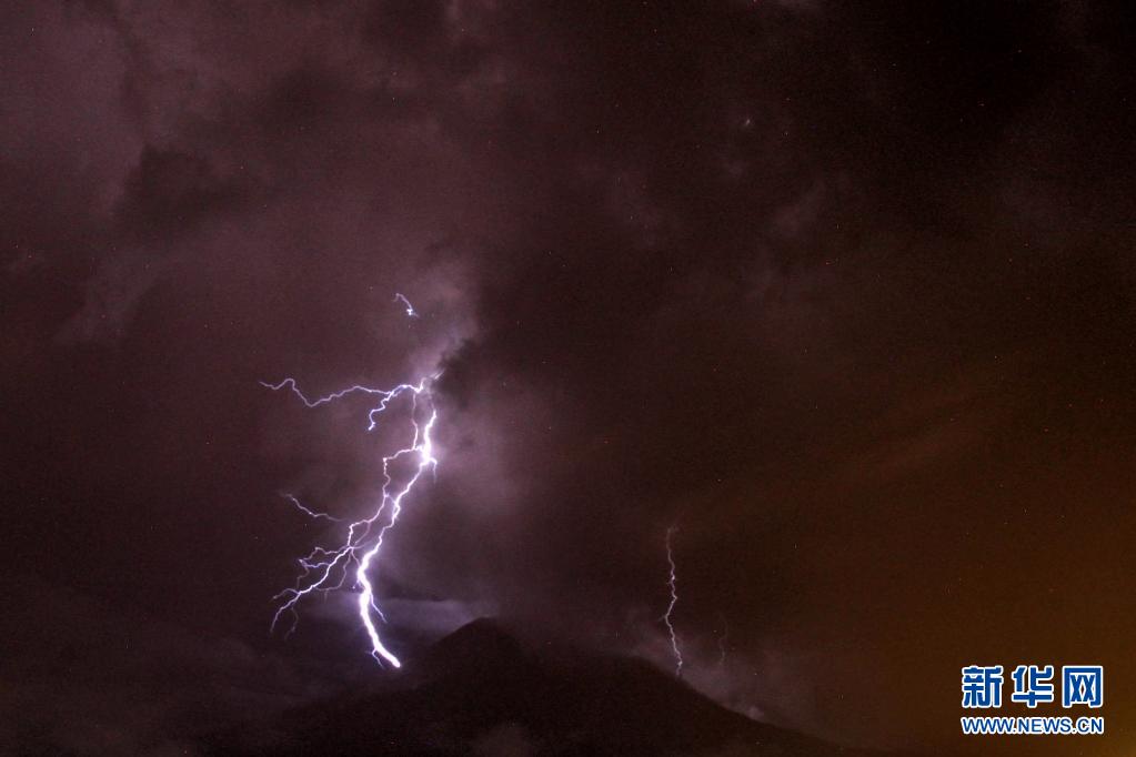這是5月13日在印度尼西亞北蘇門(mén)答臘省拍攝的錫納朋火山上空的閃電(長(zhǎng)時(shí)間曝光照片)。