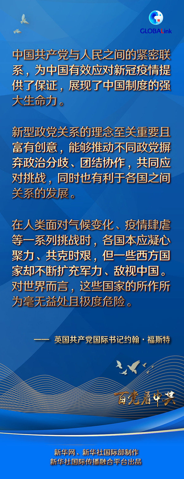 福斯特表示,作為一個領導著世界上人口最多國家的百年大黨,中共倡導建立新型政黨關系和構建人類命運共同體,對促進世界的和平與發展具有重要意義。