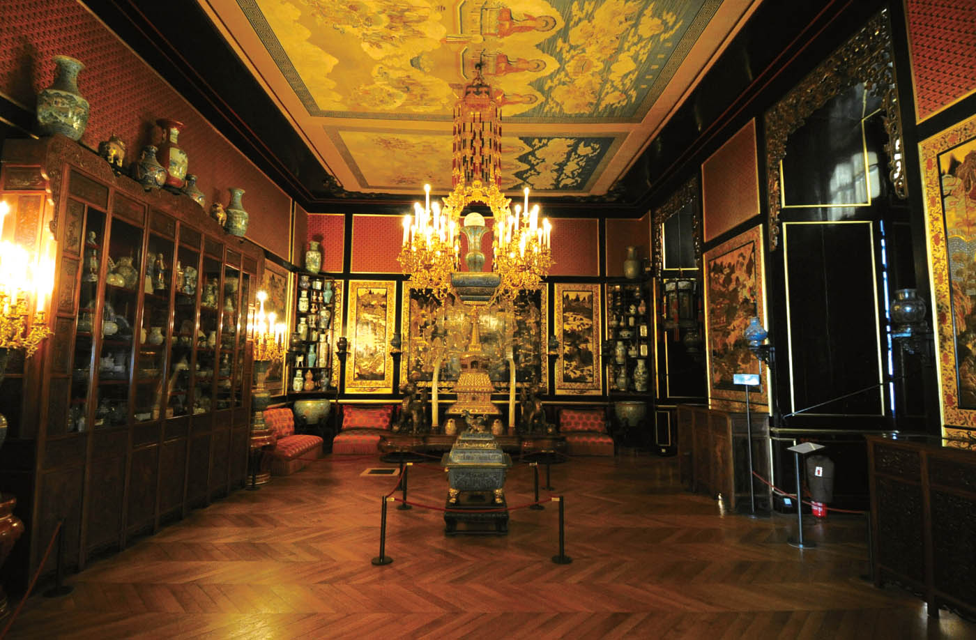 這位出生于西班牙格林納達貴族家庭的皇后,當時與奧地利的伊麗莎白皇后(即茜茜公主)并稱為歐洲兩大美人。1861 年,歐也妮皇后在楓丹白露巡游時,要求建筑師阿萊克斯巴卡樂為她修建一個大型會客廳,用來收藏來自遠東的藝術(shù)品。由此,楓丹白露便有了根據(jù)女主人鑒賞習慣布置的中國文物廳,以黑色與金色為基調(diào)作為裝飾。其中,客廳天花板下華麗的景泰藍大吊燈給人印象深刻,這是設計者巴爾巴蒂突發(fā)奇想,用中國香爐蓋改制而成。歐也妮皇后會客室里文物的擺放,體現(xiàn)出那個年代收藏者的共性,即喜愛繁復堆砌,不喜歡留白,根據(jù)物品的器形和可用空間,不管材質(zhì)、年代,全部填滿了事。館內(nèi)存放著一對金瓶,非圓明園藏品,而是中國皇帝的贈予。難怪歐也妮皇后曾感嘆:“每年中國皇帝都不忘贈送珍寶玩物為我慶祝生日,而我回贈的卻是軍隊。”